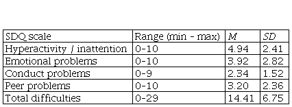 The Strengths and Difficulties Questionnaire (SDQ) has been used extensively to screen for possible mental disorders in epidemiological studies around the world (Husky et al., 2018). Children with a higher total difficulties score have greater psychopathology as judged by the prevalence of clinical disorders (Goodman & Goodman, 2009). Thus, it is a valid and efficient instrument for screening children with considerable risk of emotional and behavioral disorders.