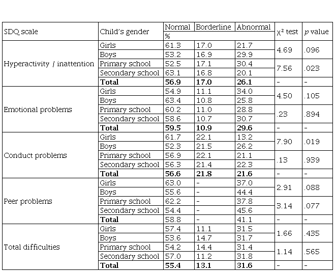 The results of cut-offs proportions of SDQ scales (presented in Table 3) revealed that according to parental rates around one fourth (26.1%) of participant children had scores in the abnormal (clinical) range of hyperactivity/inattention scale. About one third of children (29.6%) scored above the abnormal cut-off of emotional problems and around one fourth of the children (24.6%) scored above the abnormal cut-off of conduct problems. 41.1% of children were scoring in the clinical range of peer problems, although this finding should be interpreted with caution due to questionable scale reliability and due to the context of rating (e.g., children were highly restricted in live contacts with peers). In sum, a little over half of children (55.4%) had scores in the normal range of total difficulties. There were significantly larger proportion of boys in the abnormal range of conduct problems as compared to girls, and a larger proportion of primary school children in the abnormal range of hyperactivity/inattention as compared to secondary school children (see Table 2). Although based on total difficulties score proportions of boys and girls and proportions of primary- and secondary school aged children in the clinical range was comparable.