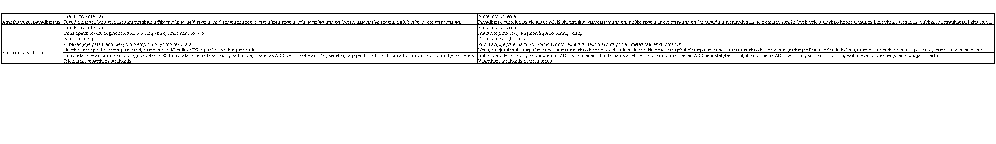 Įtraukimo bei atmetimo kriterijai. Sisteminės analizės protokolas nebuvo registruotas. Internalizuotas savęs stigmatizavimas dėl susietumo su psichikos sutrikimą turinčiu asmeniu išsamiau pradėtas tyrinėti 2008 m. (Mak & Cheung, 2008), todėl į analizę buvo įtraukti straipsniai, publikuoti 2008–2022 m. Dėl duomenų prieinamumo į sisteminę analizę buvo nuspręsta įtraukti tik viešai publikuotus straipsnius. Įtraukimo į analizę ir atmetimo kriterijai pateikiami 1-oje lentelėje.
