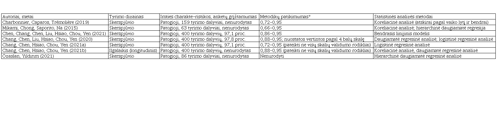 Visuose tyrimuose ryšiai tarp tėvų savęs stigmatizavimo ir psichosocialinių veiksnių buvo tiriami skerspjūvio tyrimuose, išskyrus Chang ir kt. (2021b) tyrimą, kuriame buvo taikytas ilgalaikis dizainas. Visuose tyrimuose imtys buvo patogiosios, o jų dydis svyravo nuo 63 iki 400 dalyvių. Tyrimuose buvo naudojami skirtingi statistinės analizės būdai – koreliacinė analizė, daugiamatė regresinė analizė ir kt. (žr. 2-ą lentelę). Į analizę įtrauktuose straipsniuose aprašomi tyrimai, kuriuose dalyvavo tėvai, kurių vaikams nustatytas ADS, remiantis Diagnostiniu ir statistiniu vadovu (DSM). Svarbu atkreipti dėmesį, kad Lietuvoje ADS diagnozuojamas, remiantis Tarptautine ligų klasifikacija (TLK). Vis dėlto abiejose klasifikacijose ADS simptomai panašūs (pabrėžiami sunkumai koncentruoti dėmesį ir pernelyg didelis aktyvumas ir (ar) impulsyvumas).