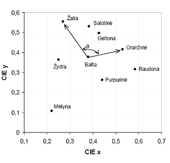 tono skirtumu (aprašomas kampu tarp dviejų spalvų baltos spalvos atžvilgiu (1-as pav.));
