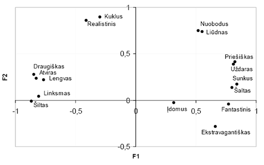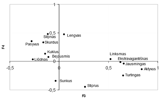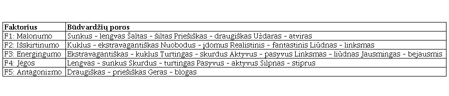 Būdvardžių faktorinė analizė leido išskirti 5 spalvų asociacijų faktorius, paaiškinančius 89 % duomenų. 3-ioje lentelėje pateikiami įvardyti faktoriai su juos geriausiai apibūdinančiomis būdvardžių poromis, o 3-iame ir 4-ame pav. pateikta, kaip būdvardžiai išsidėsto faktorinėje erdvėje.
