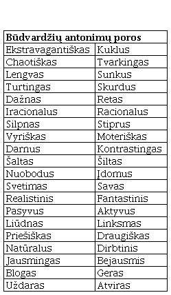 Spalvų deriniams apibūdinti buvo naudojamas būdvardžių sąrašas. Iš „Dabartinio lietuvių kalbos žodyno“ (Keinys ir kt., 1993) buvo išrinkti būdvardžiai, atspindintys spalvų sukeltas asociacijas. Pagal „Antonimų žodyną“ (Ermanytė, 2003) visi būdvardžiai buvo suskirstyti į antonimų poras. Neturintys antonimo ir panašios reikšmės būdvardžiai buvo atmesti. Trys ekspertai vertino antonimų porų adekvatumą pasirinktam tyrimo klausimui. Taip pirminis 200 būdvardžių sąrašas buvo sutrumpintas iki 40 būdvardžių, kuriuos sudarė 20 antonimų porų (1-a lentelė).
