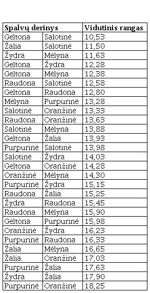 Tiriamųjų spalvų derinių vertinimo rezultatai pateikti 2-oje lentelėje. Mažesnis rango vidurkis nurodo labiau patinkančias spalvų poras.