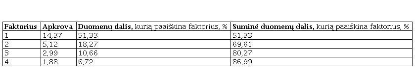 Toliau siekėme nustatyti spalvų derinių faktorius. Iš būdvardžių dažnių matricos buvo perskaičiuoti asociacijų koeficientai spalvų deriniams. Atlikus faktorinę analizę buvo išskirti 4 spalvų derinių faktoriai, paaiškinantys 86,99 % duomenų (4-a lentelė).