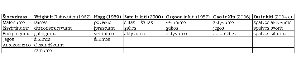 Atlikus visus skaičiavimus galima daryti keletą išvadų. Pirmiausia, buvo išskirti 5 požymiai, kuriais galima nusakyti kiekvieną spalvų porą. Taigi pagal subjektyvų įspūdį visus spalvų derinius galima grupuoti pagal 5 bruožus: malonumo, išskirtinumo, energingumo, jėgos ir antagonizmo. Šie faktoriai yra panašūs į nurodomus kitų autorių darbuose, o visiškai atitinka vieną – jėgos faktorių, – kurį išskyrė Gao ir Xin (2006) (6-a lentelė).