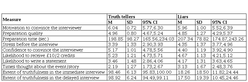 Mixed ANOVAs with Time of Interview as the within-subject factor and Veracity as the between-subjects factor were used for all the manipulation checks. Table 1 shows mean scores, standard deviations and confidence intervals for truth tellers and liars to the pre- and post- questionnaires.