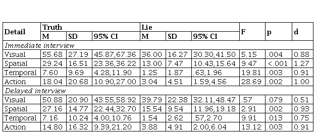 In summary, as predicted in Hypothesis 1, truth tellers reported significantly more visual, spatial, temporal, and action details than liars in the immediate statements, with large Cohen’s d effect sizes for independent samples ranging from 0.88 to 1.21. Truth tellers also reported significantly more spatial, temporal, and action details after a delay. The effect sizes samples were again large, ranging from 0.75 to 0.93. There was no difference between truth tellers and liars in the amount of visual details after a delay. Thus, Hypothesis 2 was supported for spatial details, but rejected for visual, temporal, and action details.