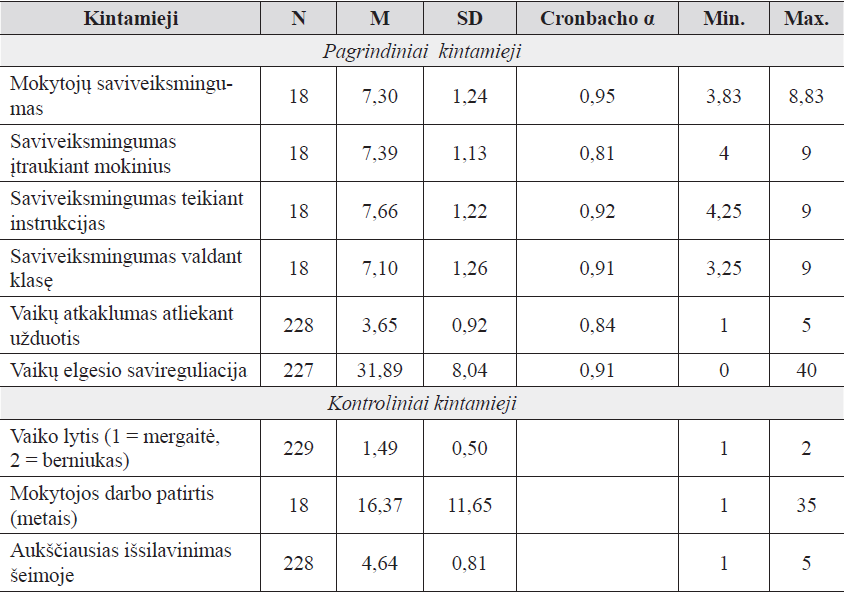 Tyrimo procedūra. Tyrimo duomenys rinkti 2017 m. balandžio–gegužės mėnesiais tęstinio tyrimo „Įsitrauk!“ (angl. “Get Involved!“; Šilinskas & Raižienė, 2017–2018) metu. Tyrimas atliktas bendradarbiaujant Mykolo Romerio (Lietuva) ir Jyväskylä (Suomija) universitetams. Šiame straipsnyje analizuoti vaikų testų ir mokytojų klausimynų duomenys. Gavus tėvų sutikimą dalyvauti tyrime, mokyklos psichologės individualiai vertino vaikų elgesio savireguliaciją. Priešmokyklinės klasės mokytojoms buvo pateikti dviejų tipų klausimynai: individualaus kiekvieno vaiko vertinimo klausimynas (vaikų atkaklumui tirti) ir bendras mokytojų klausimynas (mokytojų saviveiksmingumui tirti). Visų tyrimo kintamųjų psichometrinės charakteristikos pateiktos 1-oje lentelėje.