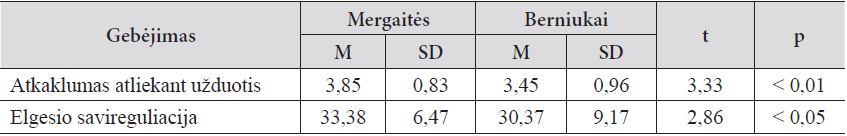 Tyrimo kintamųjų aprašomoji statistika pateikiama 1-oje lentelėje. Atkaklumo atliekant užduotis ir elgesio savireguliacijos gebėjimų palyginimas pagal lyti pateikiamas 2-oje lentelėje. Mergaitės, palyginti su berniukais atkakliau atliko mokytojų pateiktas užduotis ir geriau reguliavo savo elgesį. Koreliacijos pateikiamos 3-ioje lentelėje. Rezultatai parodė, kad didesnis mokytojų saviveiksmingumas yra susijęs su didesniu vaikų atkaklumu ir geresne elgesio savireguliacija. Aukštesnis išsilavinimas šeimoje buvo susijęs su didesniu vaikų atkaklumu atliekant užduotis bei geresne elgesio savireguliacija. Taip pat kuo atkakliau vaikai atlikdavo užduotis, tuo geresnė buvo jų elgesio savireguliacija. Vaikų atkaklumas atliekant užduotis buvo teigiamai susijęs su vaikų elgesio savireguliacija.