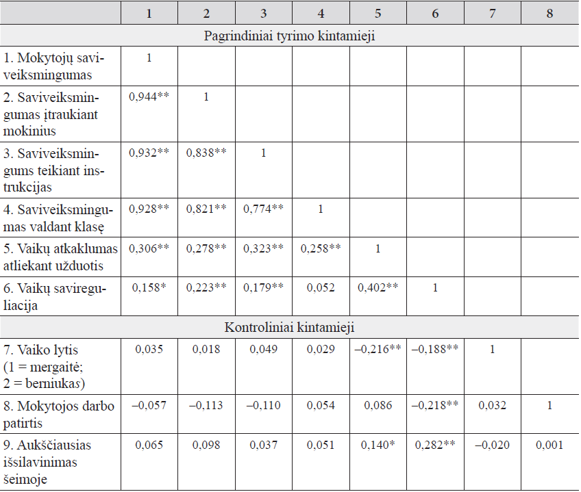 Duomenų analizė. Mokytojų saviveiksmingumo, vaikų atkaklumo atliekant užduotis ir savireguliacijos sąsajoms nustatyti buvo apskaičiuoti Pearsono koreliacijos koeficientai. Prognostiniai ryšiai analizuoti taikant hierarchinės regresinės analizės metodą. Siekiant kuo tiksliau išnagrinėti, kaip priešmokyklinės klasės mokytojų saviveiksmingumas prognozuoja vaikų atkaklumą atliekant užduotis ir savireguliaciją, pagrindinius rezultatus kontroliavome tam tikrais kintamaisiais (vaiko lytis, mokytojos darbo patirtis ir aukščiausias išsilavinimas šeimoje).