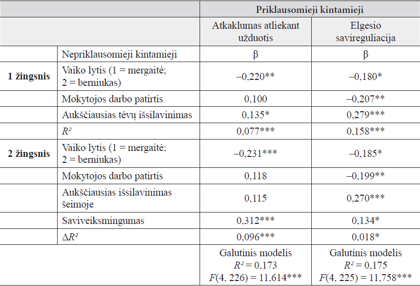 Siekiant nustatyti, ar mokytojų saviveiksmingumas prognozuoja mokinių atkaklumą atliekant užduotis ir elgesio savireguliaciją, buvo atliktos dvi hierarchinės regresinės analizės (žr. 4-ą lentelę). Pirmose analizėse priklausomasis kintamasis buvo priešmokyklinio amžiaus vaikų atkaklumas atliekant užduotis, antrose – priešmokyklinio amžiaus vaikų elgesio savireguliacija. Tiek pirmų, tiek antrų analizių metu pirmame žingsnyje nepriklausomieji kintamieji buvo vaiko lytis, aukščiausias išsilavinimas šeimoje ir mokytojos darbo patirtis. Antrame žingsnyje buvo įtraukiamas pagrindinis nepriklausomasis kintamasis – mokytojų saviveiksmingumas. Kadangi mokytojų saviveiksmingumo subskalių tarpusavio koreliacijos buvo gana aukštos, įtraukus visas tris saviveiksmingumo skales į analizę, nebuvo išvengta multikolinearumo problemos. Multikolinearumas nustatomas, jei subskalių dispersijos mažėjimo daugikliai VIF (angl. Variance Inflation Factor) yra didesni nei 4 (Čekanavičius ir Murauskas, 2014). Mūsų atveju daugiklis VIF buvo daugiau negu 4, prognozuojant atkaklumą atliekant užduotis ir prognozuojant saviveiksmingumą (saviveiksmingumo įtraukiant mokinius ir saviveiksmingumo teikiant instrukcijas). Taigi, siekiant išvengti prognozių stabilumo problemų regresijos modeliuose, buvo atsižvelgiama tik į bendrą mokytojų saviveiksmingumą (žr. 4-ą lentelę). Analizuojant visas tris mokytojų saviveiksmingumo subskales atskirai buvo gauti panašūs rezultatai kaip ir analizuojant bendrą mokytojų saviveiksmingumo skalės balą