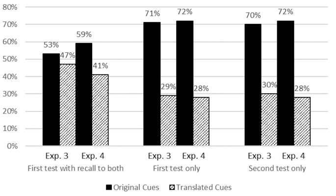 Following assessment of language ability, participants were questioned about their cued recall experience. Since the participants were presented cue-target word pairs (e.g., bed – SLEEP), conceivably they might have translated the cues of a different language (e.g., lova) back to the originally seen cue words in their search for target words (e.g., lova – bed – SLEEP). If this had happened, the intended comparison of original and translated cues would be vitiated. Hence, the participants were asked to answer these two questions: 1. Did anything catch your attention during the experiment? 2. Did you translate the words in small letters as you tried to recall the capitalized words?