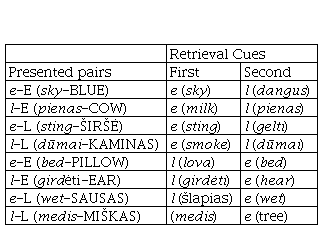 Design and procedure. The intralist cue and target words were combined to create four types of word pairs: English-ENGLISH (e-E), Lithuanian-English (l-E), English-Lithuanian (e-L), and Lithuanian-LITHUANIAN (l-L). These four pairs were crossed with strong and weak-cue associates to produce a total of eight list-presentation conditions that were counterbalanced over the 64 word-pairs.