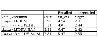 The experiment failed to find a cue and target interaction: recall of a specific language target word (e.g., SLEEP) is the same whether prompted by a word in the same language (e.g., bed) or in another language (e.g., in Lithuanian with lova). This result implies that translated equivalents have a close conceptual identity and that they are non-selectively accessible. What adds strength to this conclusion is the absence of interaction in all three analyses: for all target words, for recalled target words, and for nonrecalled target words. Especially noteworthy is the case of cued-recall for recalled target words. During free recall, the participants were able to remember these target words intact: to reproduce a meaning in its appropriate lexical form. Even so the same and different language cue words did not exert a differential effect on recall performance.