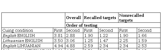 Free recall. In assessing memory for meaning, the criterion for correct recall in the free-recall analysis and the subsequent cued-recall analysis was based on the reproduction of the target concept (type) irrespective of its linguistic form (token). Free recall of target words was analyzed for the three lists with a 2 x 3 repeated measures analysis of variance. The main effect of language was highly significant,(1,35) = 21.54, < .001, = 53.00. On the average, participants recalled 5.57 Lithuanian words and 4.61 English words.