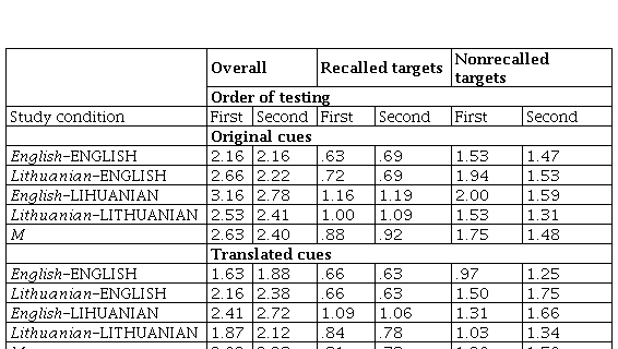 Design. The experiment consisted of two tests: free recall followed by extralist cued-recall of target words. In the free-recall test, participants were presented a list of individual target words, half of which were English, half were Lithuanian, and then asked to recall them. In cued recall they were shown English and Lithuanian extralist cues to help them recall the previously seen target words. Since the English and Lithuanian cues were crossed with English and Lithuanian targets, cued recall comprised these four experimental conditions: English cues-ENGLISH targets (.E), Lithuanian cues-ENGLISH targets (.E), English cues-LITHUANIAN targets (.L), and Lithuanian cues- LITHUANIAN targets (.L). In brief, the cued-recall portion of the experiment constituted a 2 x 2 within-subjects design.