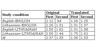 Free recall. The participants again recalled significantly more Lithuanian (M = 9.12) than English (M = 5.34) words, t(31) = 5.94, p < .001. Translations, too, were few – 3.89%. The participants translated 13 English words and 5 Lithuanian words.