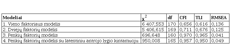 Pirmiausia buvo įvertintas PEO klausimyno penkių faktorių struktūros tinkamumas duomenims. Skirtingų faktorių skaičiaus modelių charakteristikos pateiktos 3-ioje lentelėje. Nustatyta, kad geriausiai duomenims tiko hipotetinis penkių faktorių modelis, kuriame teiginių svoriai faktoriuose svyravo nuo 0,497 iki 0,841, ir penkių faktorių modelis su antro lygmens latentiniu kintamuoju (bendruoju pilietiško elgesio rodikliu), jame faktorių svoriai svyravo nuo 0,623 iki 0,812.