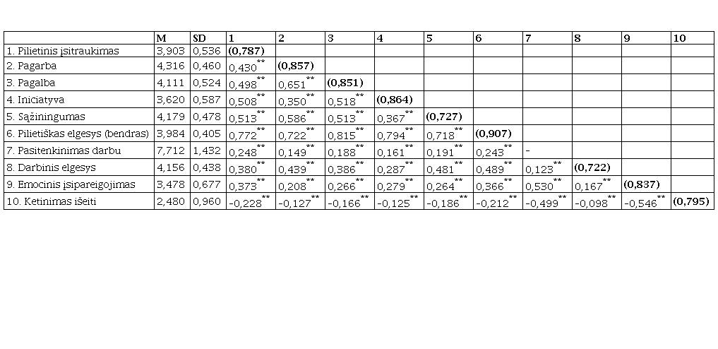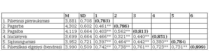 4-oje lentelėje pateikta kintamųjų aprašomoji statistika ir tarpusavio koreliacijos rodo, kad pilietiško elgesio dimensijos tarpusavyje yra susijusios vidutinio stiprumo ryšiais, ir stipriausiai kiekviena koreliuoja su bendru PEO įverčiu. Tai patvirtina, pirma, kad dimensijos nėra tapačios ir, antra, atspindi vieną bendrą konstruktą.