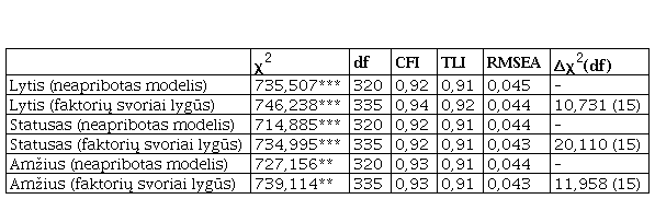 Toliau buvo atlikta PEO klausimyno invariantiškumo analizė, siekiant įvertinti, ar ta pati faktorių struktūra yra būdinga vyrų ir moterų, vadovaujančių ir nevadovaujančių bei skirtingo amžiaus darbuotojų imtims. Šios analizės rezultatai pateikiami 5-oje lentelėje.