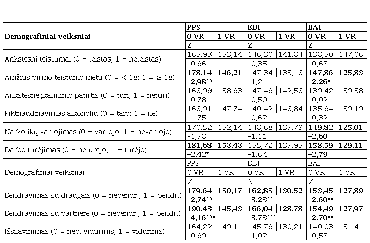 Stipresnį nerimą patiria tie tyrimo dalyviai, kurie pirmo teistumo metu buvo nepilnamečiai ( = –2,26, = 0,024), prieš patekdami į pataisos įstaigą vartojo narkotikus ( = –2,60, = 0,009) arba neturėjo darbo ( = –2,79, = 0,005), taip pat – nepalaikantys socialinių ryšių su draugais ( = –2,60, = 0,009) ar romantine partnere ( = –2,70, = 0,007; žr. 1-ą lentelę). Patiriamas nerimas taip pat siejasi su stipriau išreikštomis kriminalinėmis nuostatomis (rs = 0,285, < 0,001; žr. 2-ą lentelę).