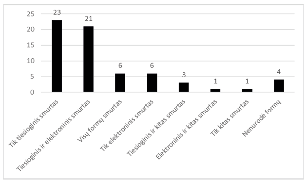 Tyrimo dalyvių pasiskirstymas pagal tyčiojimosi iš kitų formas pateiktas 2-ame pav. Tyrimo rezultatai rodo, kad daugiausia tyrimo dalyvių yra tyčiojęsi iš kitų tiesioginio bendravimo metu (23 (35,4 %)). Kiek mažiau tyrimo dalyvių nurodė, kad tyčiojosi ir tiesioginio, ir elektroninio bendravimo metu (21 (32,3 %)). Vienodas skaičius tyrimo dalyvių – po 6 (9,2 %) – nurodė, kad tyčiojosi visomis formomis ir tik elektronine forma, ir po 1 (1,5 %) – elektronine ir kita forma bei tik kita forma.