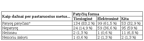 Rezultatai, kaip dažnai tyrimo dalyviai patyrė patyčias skirtingais būdais (tiesiogiai, elektroniniu ir kitu būdu), pateikti 1-oje lentelėje. Remiantis tyrimo rezultatais, daugiausia vaikų (83,2 %) nurodė, kad patyčias patyrė bendraudami tiesiogiai (gyvai). Kiek mažiau jų nurodė, kad patyrė patyčias elektroniniu (61,5 %) bei kitu būdu (32,9 %).