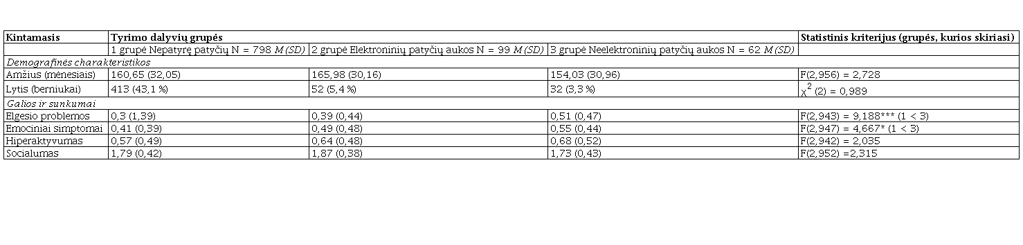Siekiant nustatyti, kaip elektroninių patyčių patyrimas (arba buvimas auka) susijęs su tyrimo dalyvių emocinių ir elgesio sunkumų raiška, tyrimo dalyviai buvo suskirstyti į tris grupes: pirma grupė – nepatyrę jokių patyčių, antra grupė – patyrę elektronines patyčias (šiai grupei priskiriami visi tyrimo dalyviai, kurie nurodė, kad patyrė tik elektronines patyčias arba elektronines ir kitų formų patyčias) ir trečia grupė – patyrę patyčias neelektronine forma. Pirmajai grupei priskirti 798 (78,9 %) tyrimo dalyviai, kurie nurodė, kad nėra patyrę patyčių, t. y. jie nėra patyčių aukos. Antrai grupei priskirti 99 (9,8 %) tyrimo dalyviai, kurie yra elektroninių patyčių aukos. Trečioje grupėje yra 62 (6,1 %) tyrimo dalyviai, kurie yra neelektroninių patyčių aukos, t. y. patyrę tiesiogines ar kitų formų, išskyrus elektronines, patyčias. Šių grupių tyrimo dalyvių palyginimas pagal demografines charakteristikas ir galias bei sunkumus pateiktas 2-oje lentelėje.