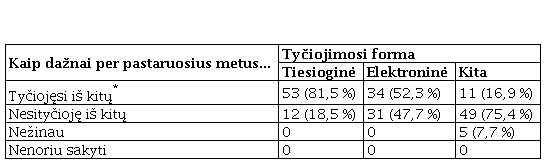 Rezultatai, kaip dažnai tyrimo dalyviai tyčiojosi iš kitų skirtingais būdais (tiesiogiai, elektroniniu ir kitu būdu), pateikti 3-ioje lentelėje. Tyrimo rezultatai rodo, kad daugiausia tyrimo dalyviai nurodė, jog tyčiojosi iš kitų tiesiogiai (gyvai) bendraudami (81,5 %). Kiek mažiau jų nurodė, kad tyčiojosi naudodami mobilųjį telefoną ar internetu (52,3 %). Mažiausiai tyrimo dalyvių nurodė, kad tyčiojosi kitu būdu (16,9 %).