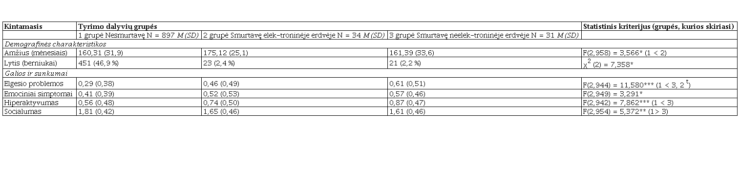 Siekiant nustatyti, kaip tyčiojimasis iš kitų susijęs su smurtautojų emocinių ir elgesio sunkumų raiška, tyrimo dalyviai buvo suskirstyti į tris grupes (pirma grupė – nesityčioję jokia forma, antra grupė – tyčiojęsi elektronine forma (šiai grupei priskirti visi tyrimo dalyviai, kurie nurodė, kad tyčiojosi tik elektronine arba elektronine ir kitomis formomis) ir trečia grupė – tyčiojęsi neelektronine forma (tiesiogiai ir (ar) kita forma). Pirmajai grupei priskirti 897 (88,6 %) tyrimo dalyviai, kurie nurodė, kad nėra smurtavę prieš kitus. Antrai grupei priskirti 34 (3,4 %) tyrimo dalyviai, kurie yra smurtavę elektroninėje erdvėje. Trečioje grupėje yra 31 (3,1 %) tyrimo dalyvis, kuris yra smurtavęs neelektroninėje erdvėje. Šių grupių tyrimo dalyvių palyginimo rezultatai pagal demografines charakteristikas ir galias bei sunkumus yra pateikti 4-oje lentelėje.