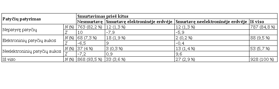 Patyčių patyrimas ir smurtavimas prieš kitus. Tyrimo dalyvių pagal patyčių patyrimą ir smurtavimą prieš kitus proporcijų palyginimas pateiktas 5-oje lentelėje. Rezultatai rodo, kad skiriasi nepatyrusių patyčių ir jas patyrusių tyrimo dalyvių proporcijos skirtingose grupėse pagal smurtavimą prieš kitus (χ. (4) = 177,564, . < 0,001). Daugiau tų tyrimo dalyvių, kurie nebuvo patyrę patyčių, nebuvo įsitraukę ir į smurtavimą prieš kitus. Daugiau tyrimo dalyvių, kurie yra patyrę elektronines patyčias, smurtavo prieš kitus elektroniniu būdu, o tyrimo dalyviai, kurie buvo patyrę patyčias ne elektroniniu būdu, dažniau smurtaudavo taip pat neelektroniniu būdu. Taigi panašu, kad patyčių patyrimo – tiek būnant auka, tiek smurtautoju – aplinkos sutampa.