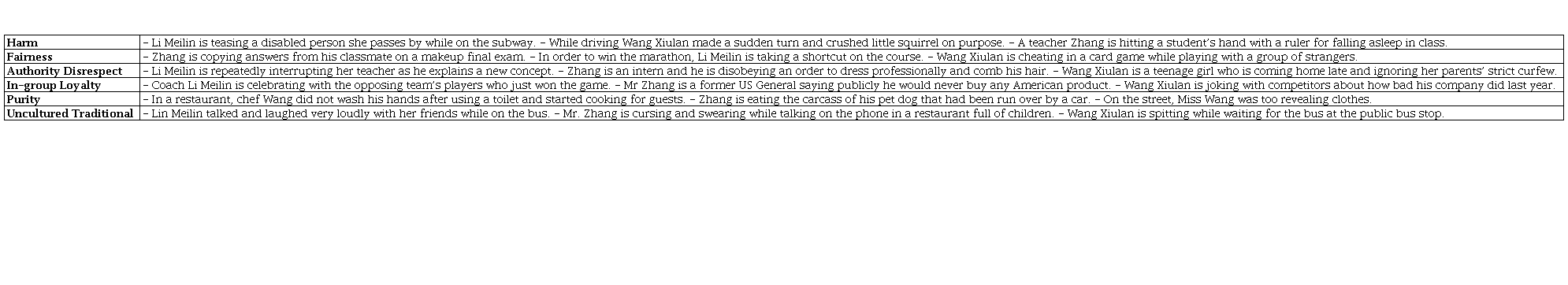 Thus, bringing all these strands together, we hypothesize that Chinese participants (a) will have a strong normative conviction towards situations that depict standard Turiel-type or Haidt-type of moral transgressions. Moreover, given the long-standing influence of the Confucian ethical tradition on historical and contemporary China, we hypothesize that participants (b) will also have a strong normative conviction towards situations that depict the overlapping lists of bu daode (usually translated as “moral”) and bu wenming (uncultured) behavior, which corresponds to Turiel’s violation of conventional norms. We also hypothesize that participants (c) will have a strong normative conviction towards violations of traditional values of xiao (filial piety). Finally, we predict that Chinese participants will express not only five Haidt-type normative considerations, but also will be concerned whether an action is generally an instance of bu wenming (unculturedness).