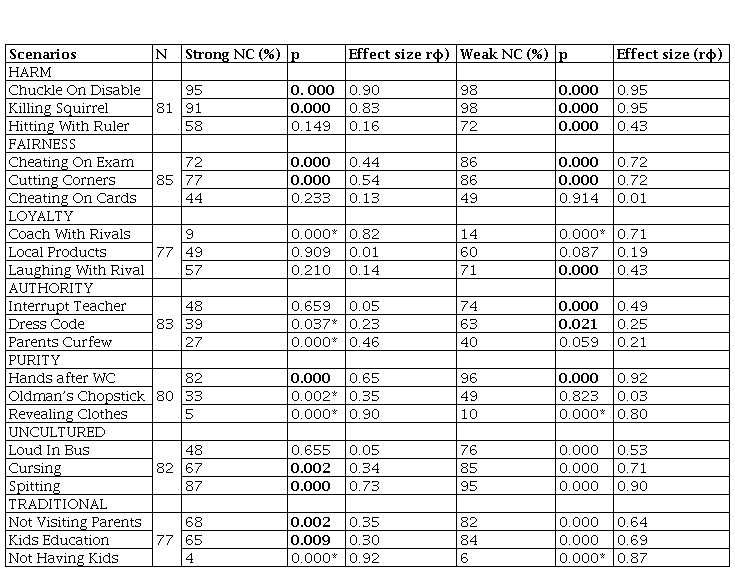 Table 1 provides frequencies of normative conviction (NC) responses in each scenario.