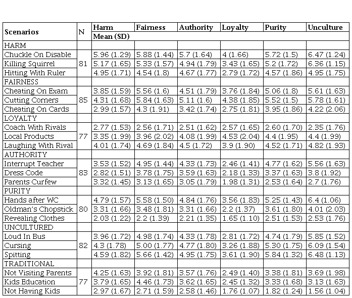 It seems that these latter scenarios, contrary to Clifford et al. results (2015), are bad examples of domain-specific transgressions. Our results show the opposite – it is overwhelmingly a non-moral issue. It should be noted that these transgressions have not been generated by Chinese participants themselves. As a result, the presented scenarios might be culturally biased and therefore not touch on the concerns of the Chinese young adult population. Similar issues have been encountered in the Moral Foundations Questionnaire (Graham et al., 2011), where a recent replication of the MFQ did not succeed to uncover a five-factor model across different cultures, casting some doubt on the cross-cultural generalizability of five moral foundations (Iurino & Saucier, 2019; though see Doğruyol, Alper, & Yilmaz, 2019 for an alternative analyses). Again, items on the MFQ might be culturally biased, this way creating measurement variance. Indeed, recent attempt to validate MFQ with Chinese sample showed that “concrete statements were less representative of the corresponding moral dimensions” (Zhang & Li, 2015, p. 162), pointing to some external validity issues. So, in the future studies, it is advisable to extract relevant items from the population under study. This way MFQ, and other questionnaires, will only benefit and enhance internal and external validity.