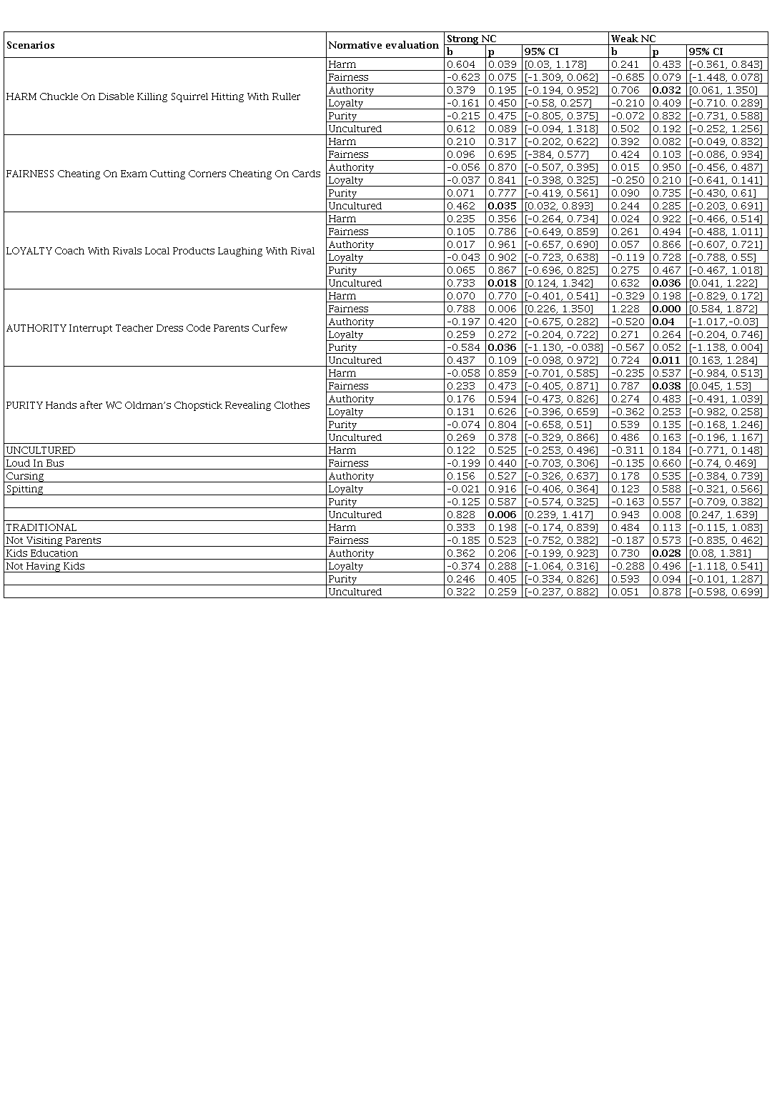 Table 3 shows that, overall, only few normative considerations were significant predictors of NC responses. In the case of strong NC, harm consideration, unsurprisingly, was the only significant predictor (. = 0.604, 95% CI [0.03, 1.178], . = 0.039) in the domain of harm-based scenarios. Surprisingly, in the domain of fairness-based scenarios, the fairness consideration was not a significant predictor (. = 0.096, 95% CI [–0.384, 0.577], . = 0.695). Instead, for Chinese participants, the consideration of unculturedness (wenming) emerged as the only significant predictor (. = 0.462, 95% CI [0.032, 0.893], . = 0.035). Indeed, the consideration of unculturedness (wenming) emerged as a significant predictor in two other domains: the loyalty domain (. = 0.733, 95% CI [0.124, 1.342], . = 0.018) and wenming domain (. = 0.828, 95% CI [0.239, 1.417], . = 0.006). While in the domains of purity and traditional value of xiao, none of the normative considerations emerged as a significant predictor. In the case of weak NC, the pattern was even less clear-cut; the consideration of unculturedness emerged as a significant predictor in two domains: the loyalty domain (. = 0.632, 95% CI [0.041, 1.222], . = 0.036) and authority disrespect domain (. = 0.724, 95% CI [0.163, 1.284], . = 0.011). Similarly, the consideration of fairness emerged as a significant predictor in two domains: the authority disrespect domain (. = 1.228, 95% CI [0.584, 1.342], . = 0.000) and purity domain (. = 0.787, 95% CI [0.045, 1.53], . = 0.038). Also, the consideration of authority respect was as a significant predictor in two domains: the harm domain (. = 0.706, 95% CI [0.061, 1.35], . = 0.032) and the domain of the traditional value of xiao (. = 0.73, 95% CI [0.08, 1.381], . = 0.028).