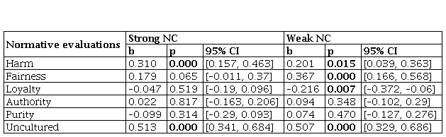 To see specific patterns in the ratings and to test for the effects of participants’ normative considerations on the NC evocations, we conducted a series of regression analyzes. However, given the fact that in some cases participants almost unanimously agreed about the action’s wrongness (see Table 1, especially Harm scenarios), a binary logistic regression, with NC as an outcome variable (0 – No, 1 – Yes), is not a feasible analysis. Besides, there would be too many (21+21) regression analyses. For these reasons, we adopted a data reduction strategy. That is, each participant received three scenarios and three pairs of NC responses; this way there can be four possible responses — from 0 to 3 NC responses. Thus, we created a new ordinal variable, where each participant’s response to NC questions was summed (as a response to a 4-point ordinal scale). As a result, only 14 regression analyzes have been performed. More specifically, using all six considerations (harm, fairness, authority respect, in-group loyalty, purity and unculturedness) as predictors and sums of strong/weak normative convictions as the outcome variables, ordinal regressions were conducted for each domain separately.