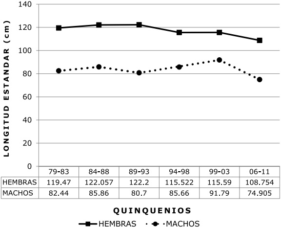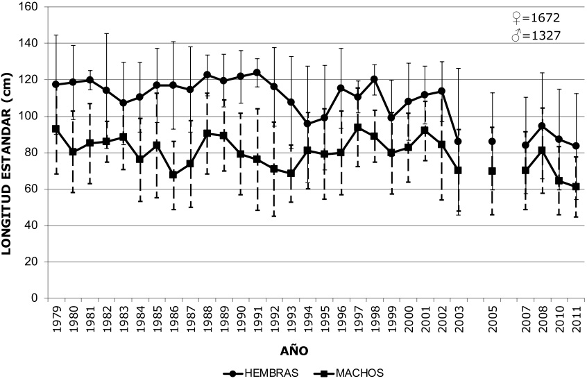 Average capture size. In Puerto López from 1979-2011 the average annual catch size was between 123.8±7.6 cm LS in 1991 and 83.4±29.2 cm in 2011 for females and between 93.3±22 in 1997 and 61±16 cm in 2011 in males. In figure 2 a gradual tendency to diminish in size can be observed in the average annual catch sizes of the males in comparison with the females; in the first 15 years of records (1979 a 1993) the average difference in this parameter between the two sexes was 35.8±8.1cm, which decreased to 23.4±7.2 cm over the next 10 years (1994-2002) and finally reached 17.7±4.2 cm in the last seven years (2005–2011). This behavior was due to a decrease over time of the average annual capture size of females.