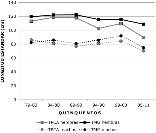 Where gonadal maturity (TMG) is considered the size at 50%, measurement that was used to make comparisons between quinquennium.
