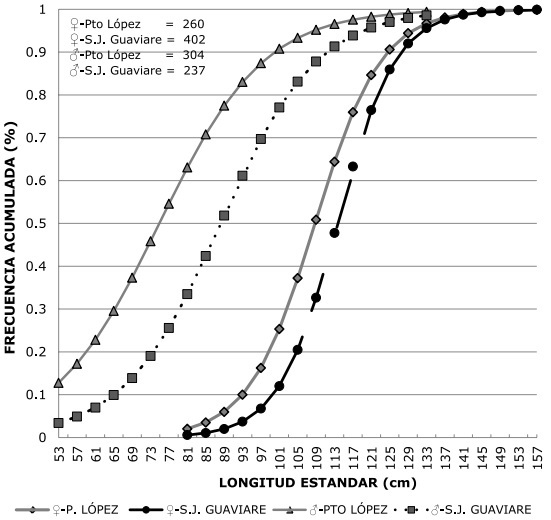 At the head of the Guaviare River the TPCA of females (102.9 ± 26.8 cm LS) is less than the TMG (108.8 cm LS), in males the TPCA (78.9 ± 24.6 cm LS) is lower than TMG (88.3 cm).