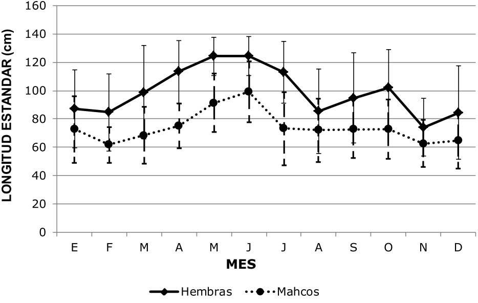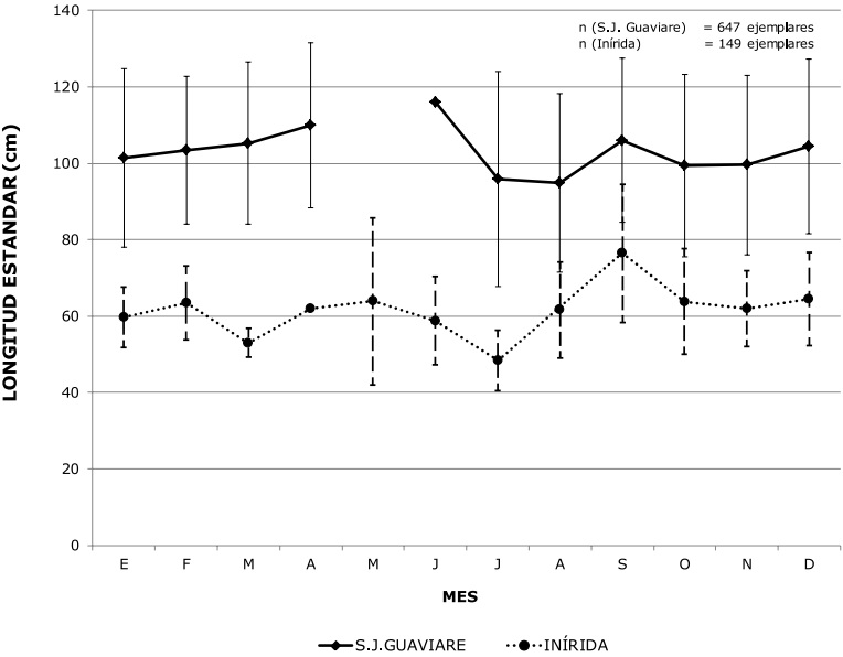 Within the hydrological cycle, the behavior of the average size of monthly catch (TPCM) in the upper Meta River (Figure 3) was analyzed, and significant differences (p<0.05) were found in the size of females captured April to July (between 113 and 124 cm LS) with respect to the other months of the year (between 74 and 102 cm LS). This dynamic was also observed in males for the months of May and June (p<0.05), with significantly higher sizes (between 75 and 109 cm LS) than in the rest of the annual cycle (between 62 and 73 cm). The season with largest sizes coincides with the breeding season of the species in the period of rising waters.