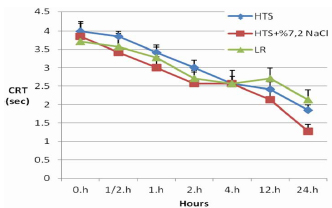 In comparison with 0 hour value, the degree of dehydration started to decrease at 2nd hour in HTS + 7.2% NaCl combination group, and at 4th hour in HTS and LR group. There were no dehydration symptoms after 24 hours of treatment in HTS + 7.2% NaCl combination and HTS groups; however, dehydration symptoms were evident in LR group. Decrease in dehydration (Table 1) was significant at 12th hour in HTS + 7.2% NaCl group when compared with HTS and LR group (p<0.05). There were varying degrees of mental status impairment in all calves and it was found to be associated with the severity of metabolic acidosis. Improvement in mental status seen in all groups after treatment however there were no differences between groups. But when compared to 0 hour, improvement started at 2nd hour in HTS and HTS + 7.2% NaCl groups and at 4th hour in LR group. Albeit there was no statistical differences between groups, according to us clinical improvement in mental status was better than others in HTS + 7.2% NaCl group. Capillary refill time was shortened in all groups after treatment. Shortening in CRT was statistically significant in 1st hour in HTS + 7.2% NaCl combination and LR group and in 2nd hour in HTS group. When compared between groups statistical difference was seen in 24 th hour and more prominent in HTS + 7.2% NaCl group (Figure 1).
