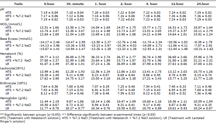 Various degrees of metabolic acidosis were observed in groups at the beginning of the study. Group interaction was not observed in blood gas variables observed among group involved (Table 3). WBC, RBC counts and Hematocrit value was increased in all groups before treatment and decreased after the treatment. Hemoglobin value was decreased in all groups after treatment however no statistical differences were detected for Hematological variables.