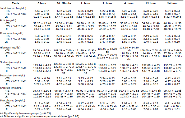 There were no differences in total protein measurements between groups. When compared within groups there was difference in points of time in LR group. Increases in both BUN and creatinine were detected in all groups due to prerenal azotemia at 0 hour. However, they decreased after treatment and no differences were detected in all groups. Sodium concentrations were statistically significant between groups at 30th minute and 1st hour after treatment. When compared with HTS group increase in sodium value was evident in HTS + 7.2% NaCl combination and LR groups. There were no differences in chloride concentrations between groups but there was a difference in points of time in HTS group. Serum potassium concentration was high at 0 hour in all groups and they decreased after treatment and no statistical differences were detected. Glucose concentrations were increased when compared with 0 hour but no differences detected between groups. But statistical significance was present at all time points in HTS and LR group. Phosphorus concentrations were decreased when compared with 0 hour but no differences detected between groups. However, in HTS + 7.2% NaCl combination group decreases in phosphorus after treatment was statistically significant in points of time (Table 2). All the calves were survived.