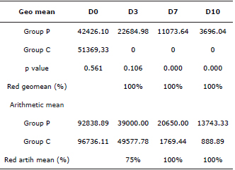 In the present study Cq treatment significantly reduced the cyst excretion calculated based on geometric or arithmetic means by 100% on days 7 and 10 after the start of the treatment, resulting in a significant reduction (p<0.001) in cyst excretion in chloroquine treatment group.