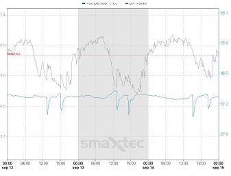 Maximum value of pH is reached just before feed supply, which agrees with the findings reported by Calsamiglia et al (13) and González et al (14). Feed intake takes place around maximum pH values, whilst minimum pH values were the result of the maximum fermentative activity within the rumen after a considerable amount of feed intake. According to Crater et al (15), pH value gradually drops immediately after feed supply and returns to previous values in 24 h, as it can be seen in figures 1 and 2.