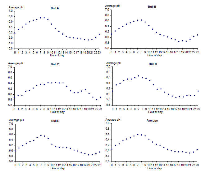 Statistical analysis. Data on rumen pH and temperature were first averaged for each day: maximum, minimum and mean, area under the curve, and time spent below pH thresholds of 7.0, 6.6, 6.2, 5.8, 5.4 and 5.0. The area under the curve was calculated by multiplying the absolute value of the deviation in pH by the time (min) the pH was below the threshold, and expressed as pH units×min. The value of the average pH for each hour within each day was also calculated for each animal.