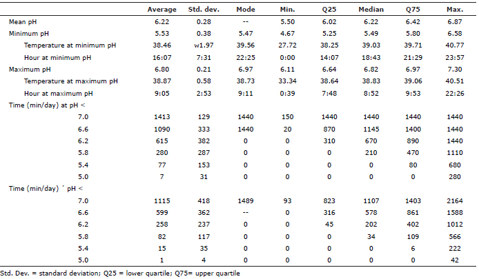 Maximum and minimum values of hours at maximum and minimum pH seemed to indicate that these pH values were reached sometimes at specific moments during the night. Nevertheless, quartiles, mode and mean values indicate that minimum pH was often reached in the afternoon (between 15:00 and 17:00), that is to say, 5 to 8 hours after feed supply. Likewise, maximum pH value was reached early in the morning (between 8:00 and 10:00). The area under the curve (Time (min/day) x pH) for pH below 5.4 was, on average, 14 min, with a maximum of 30 min for some animals.