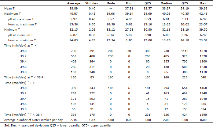Table 3 shows average temperature values of the 5 animals monitored in the experiment. Neither average nor maximum values observed in this experiment were high enough to be related to the development of pathologies or infections that could affect the animals’ health. The relative low values of minimum ruminal tempetature (around 32°C) observed could be linked to the moments when the animals drank water.