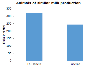 In the animals of this study, much greater (at least 5x) tick counts were observed than those observed in the Hacienda el Chaco by Salazar et al (2). This could be due to differences in management and use of acaricides, plus the difference in the genetic component of animals evaluated in both studies.